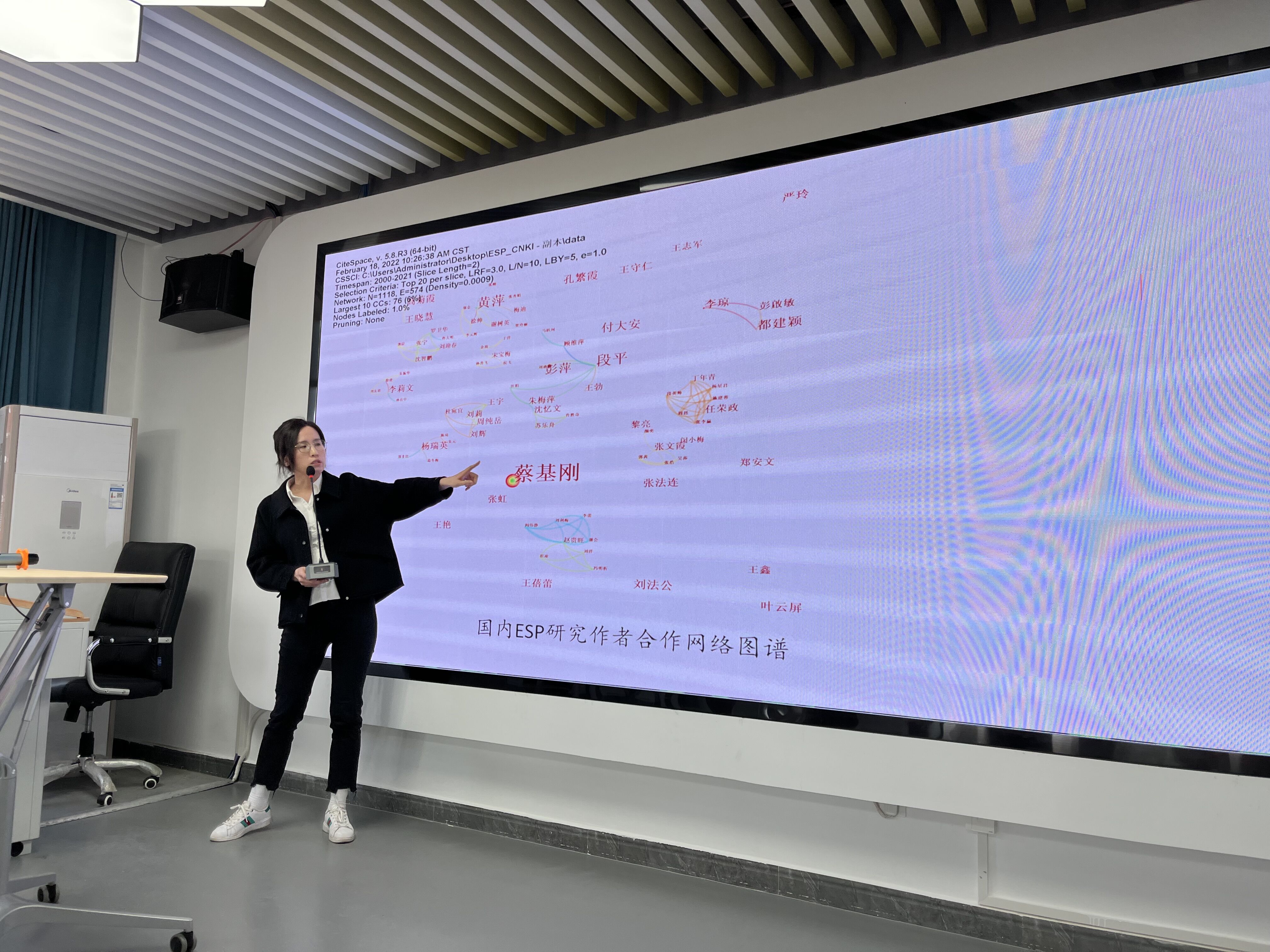 王敬霞老师从以下几个方面展开演讲:1、Citespace软件及主要功能介绍;2、Citespace软件的下载与安装;3、Citespace数据导入及图谱输出——以WOS和CNKI操作为例进行实例讲解。她以国内ESP研究为例,通过向大家呈现多个图谱,形象地展示Citespace的多元化功能,接着又细致地指导该软件的下载及安装细节,以及如何一步一步地从WOS和CNKI导入数据、形成图谱和调整修改等,事无巨细的讲解给大家留下了深刻的印象。