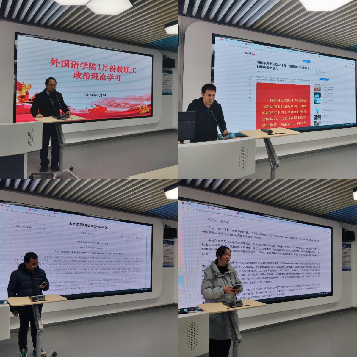 1月15日下午,外国语学院在产教大楼301展开了一月份的政治理论学习。会议由学院分党委副书记魏伟主持,全体教职工参与学习。