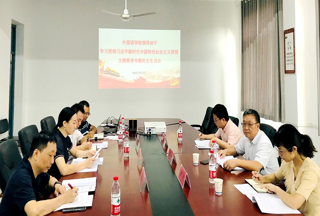本网讯(文 魏伟/图 柯宁立)9月7日下午,外国语学院分党委在学院3503会议室召开学习贯彻习近平新时代中国特色社会主义思想主题教育专题民主生活会。学校第八督导组组长王镇到会指导。学院分党委班子成员参加会议。会议由分党委书记郭义坤主持。