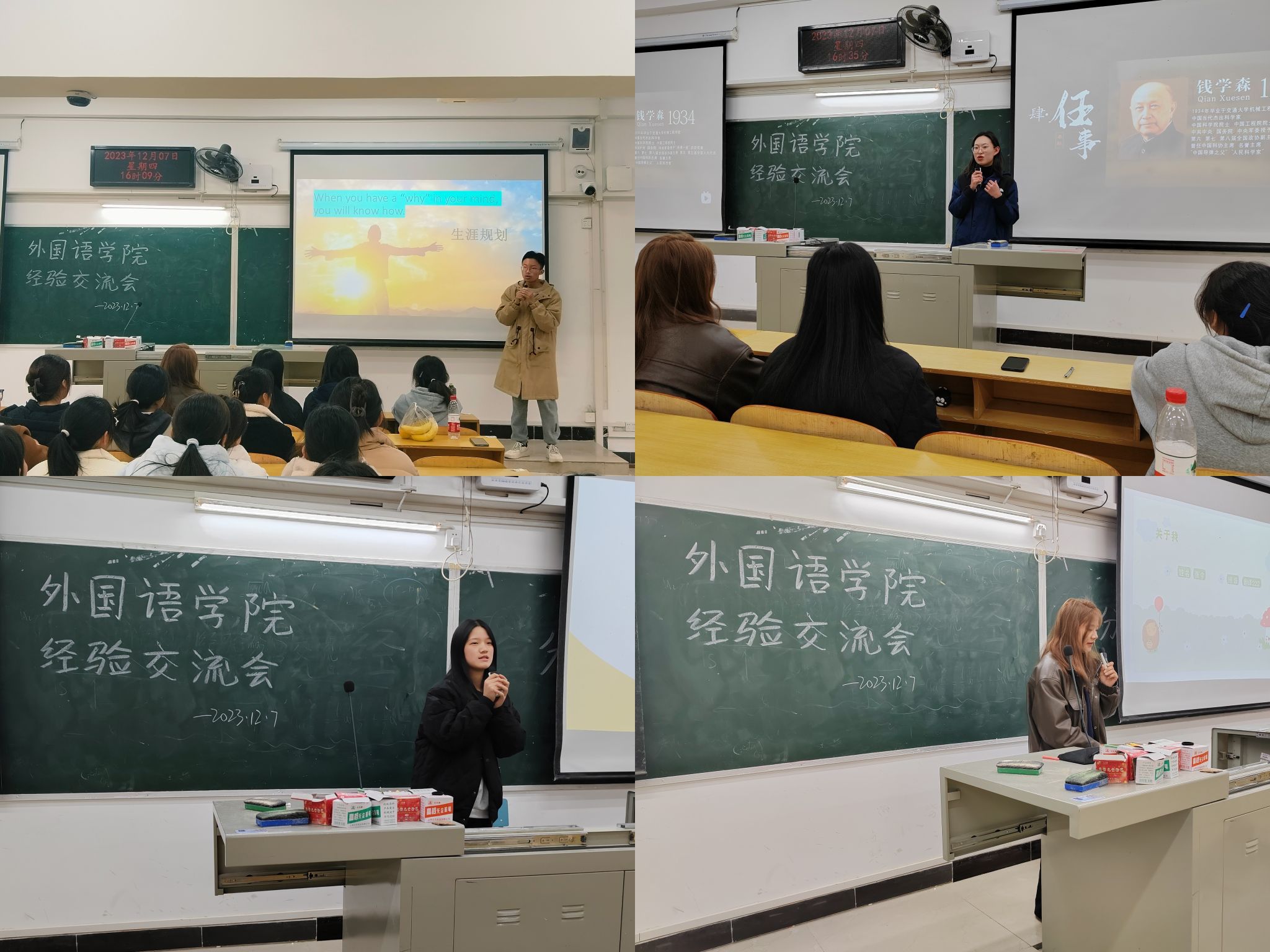 为帮助新生更好的了解大学生活,帮助同学们树立目标,外国语学院于12月7日16:00在5303教室开展了经验交流分享会,同时邀请到国奖获得者罗英杰、李云霞同学,国家励志奖学金获得者石玉好、明静、张令同学作学习经验分享。