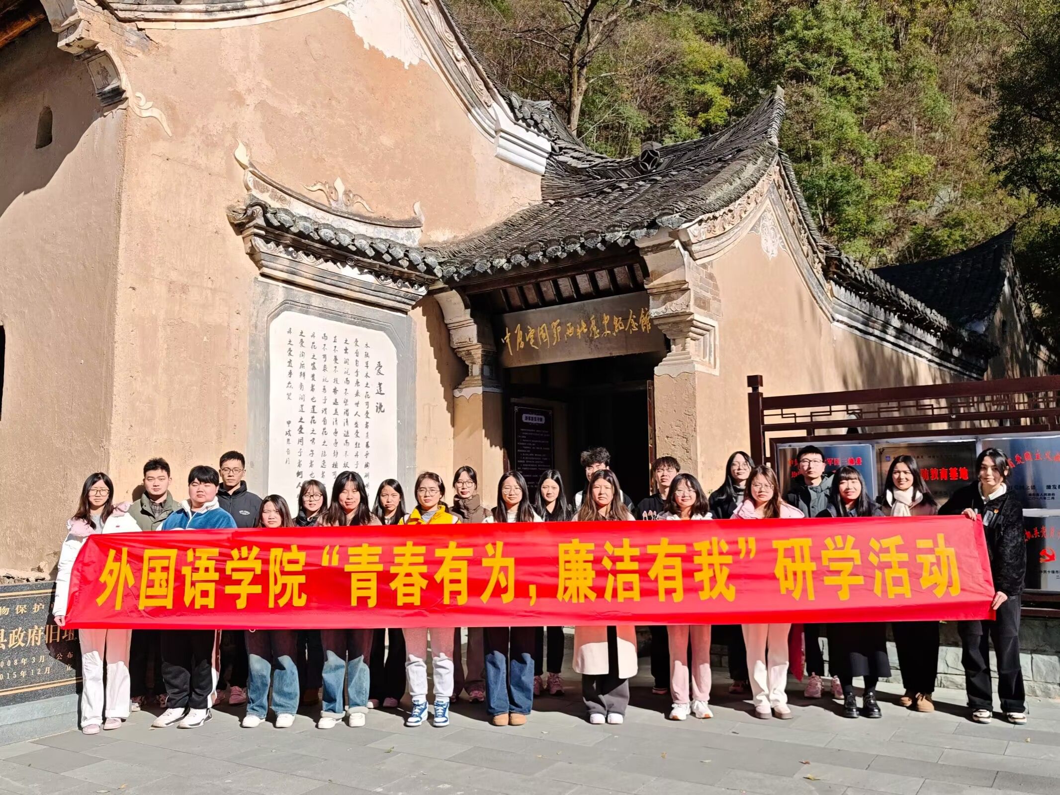 为纵深推进党风廉政建设,营造风清气正的良好生态,不断开创清风外院建设新局面,12月1日,外国语学院师生赴东沟红色教育基地开展廉洁教育团建活动。由外国语学院学工办主任魏院珍和辅导员孟甜带队,学院学生干部代表参加活动。
