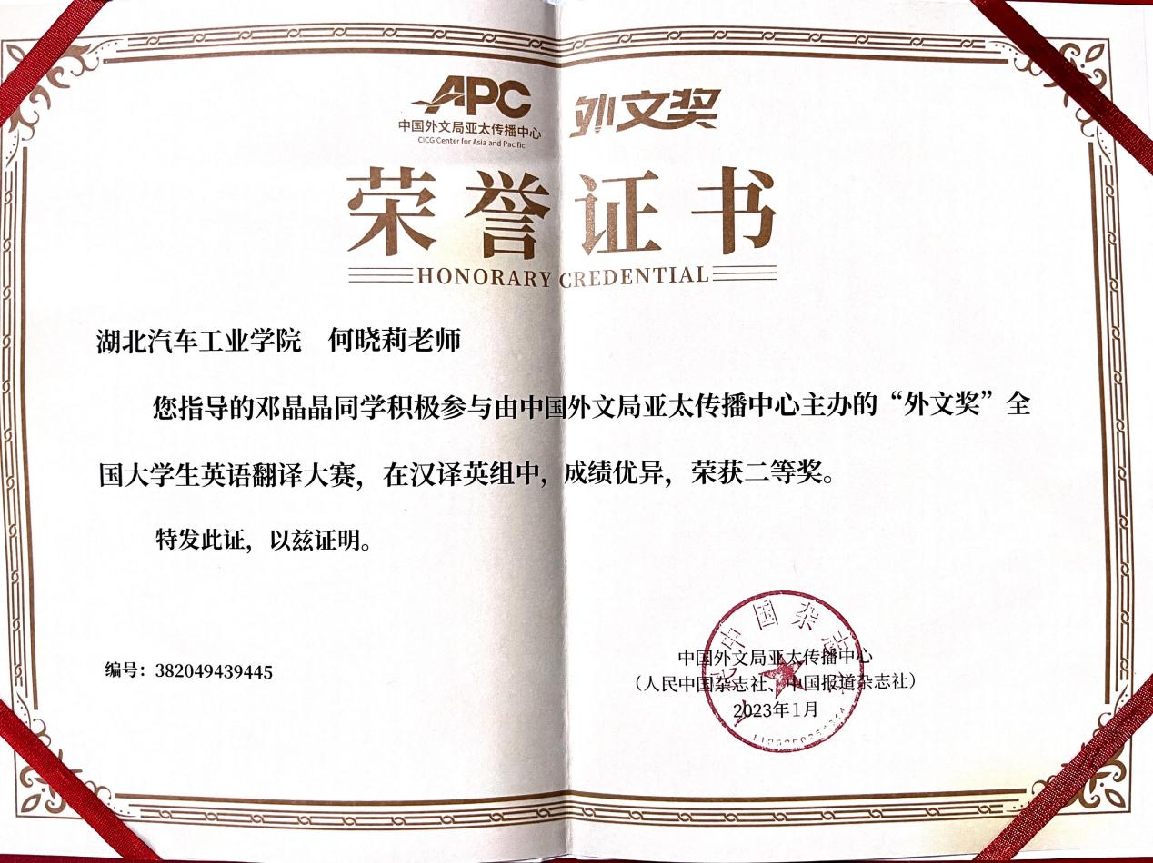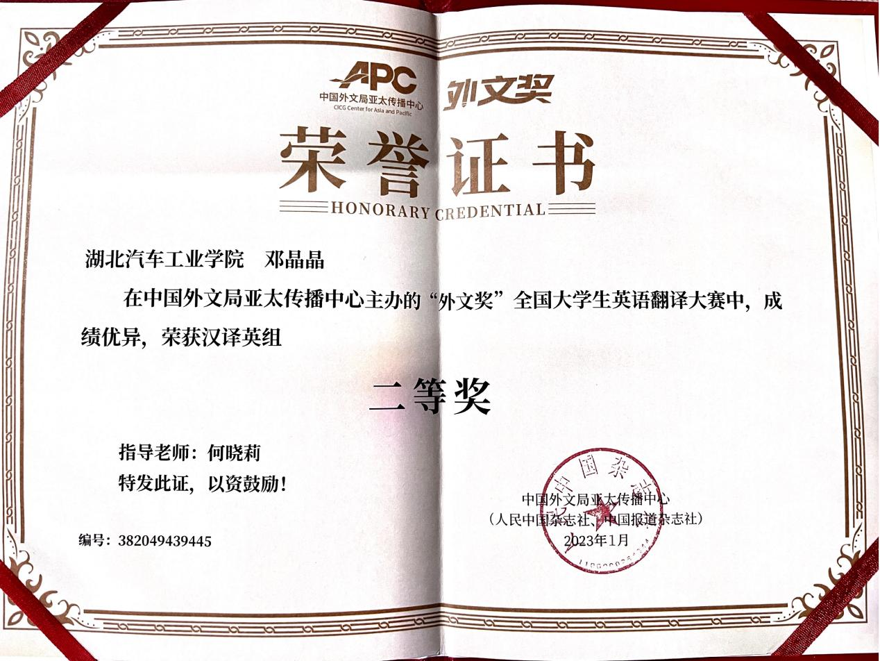 2022年“外文奖”全国大学生英语翻译大赛于11月29日结束,大赛共有复旦大学、上海外国语大学、南开大学、北京外国语大学、同济大学等在内的两千多所高校6887名学生参加。经过初评(盲审)、复评(排名)及终评三个阶段的评审,我院翻译201邓晶晶同学获得汉译英组全国二等奖,翻译系何晓莉老师获指导教师奖。