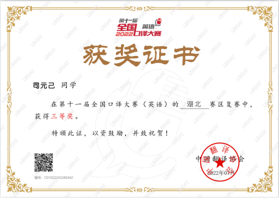 6月26日,第十一届全国口译大赛(英语)湖北赛区复赛落下帷幕,经过选手不懈努力和竞赛团队悉心指导,我院翻译201陈天林、翻译191司元己2位同学获得佳绩,成功晋级交传(半决赛),系我校选手首次进入该项赛事半决赛。