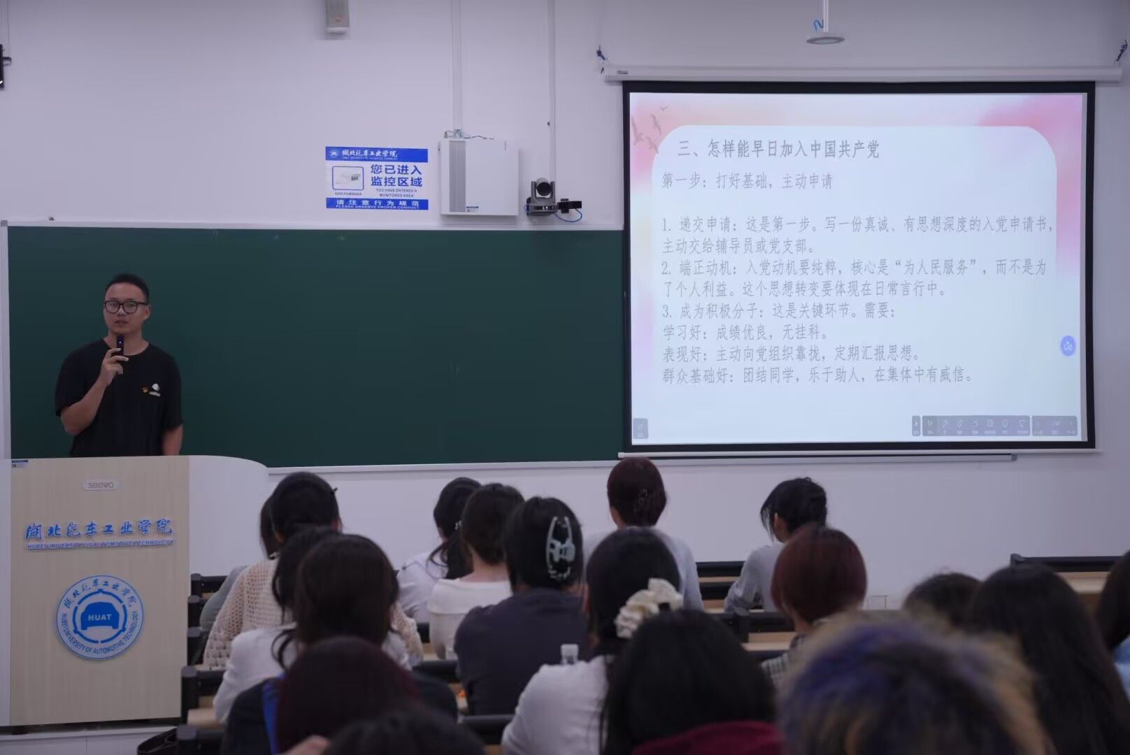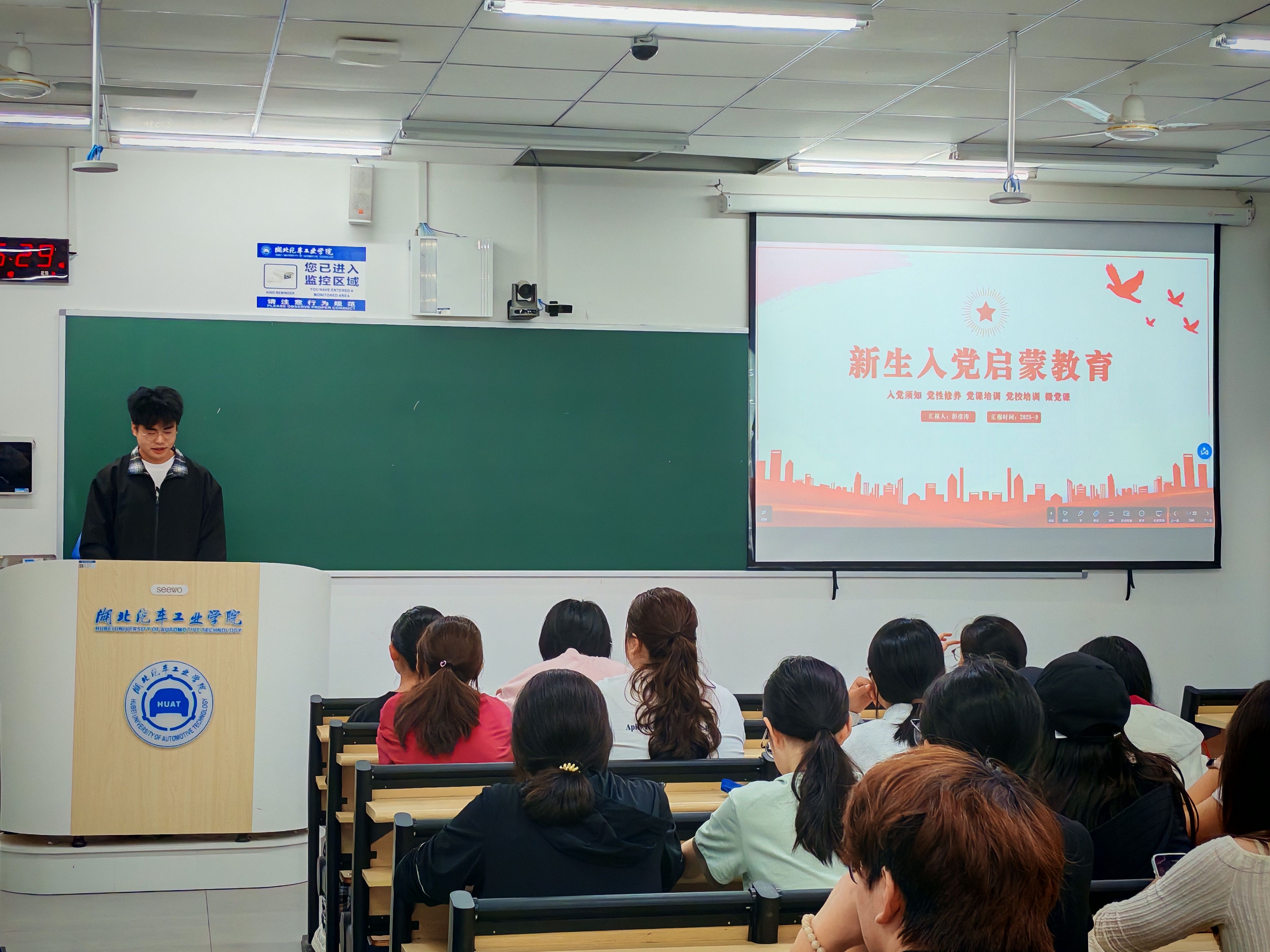 在第八教学楼8206、8207、8211教室开展入党启蒙教育,2025级全体新生参加,学生党员成林涛、张锦洋、彭彦涛、张帆顺担任主讲人。