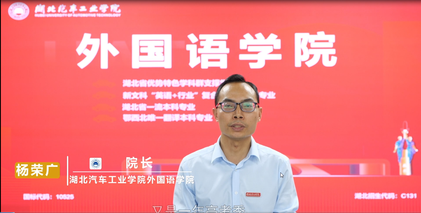 外国语学院院长杨荣广,外国语学院始建于1977年,2001年成立外语系,2005年起招收本科生,2014年更名为外国语学院,现开设英语和翻译两个本科专业。其中,英语专业是“湖北省一流专业”,翻译专业是鄂西北地区唯一的翻译本科专业。学院现有教授4人,博士11人(含在读),有英、日、德等多个语种教师,建有省级一流课程2门、校级一流课程6门。学院重视学生语言应用能力的培养,历届毕业生中多人考取武汉大学、华中科技大学、北京理工大学、四川大学、中山大学、英国南安普顿大学、澳大利亚麦考瑞大学等国内外一流大学硕士研究生。近年来,外院学子先后荣获“外研社杯”全国大学生英语演讲比赛全国二等奖、全国外贸从业能力大赛团体一等奖等国家级、省级竞赛奖项数十项。
