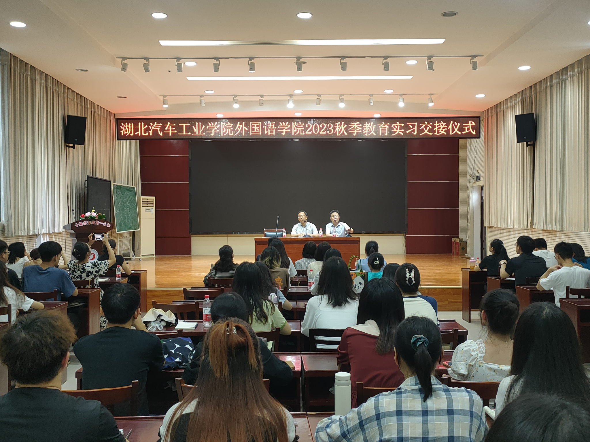 2023年9月11日上午,外国语学院副院长翟全伟、实习指导教师王吟、田丹等8人赴东风一小开展2023年秋季教育实习交接仪式。十堰市张湾区教育局副局长张红萍,科长孙章伟及各实习学校带队领导热情接待了外院师生一行。