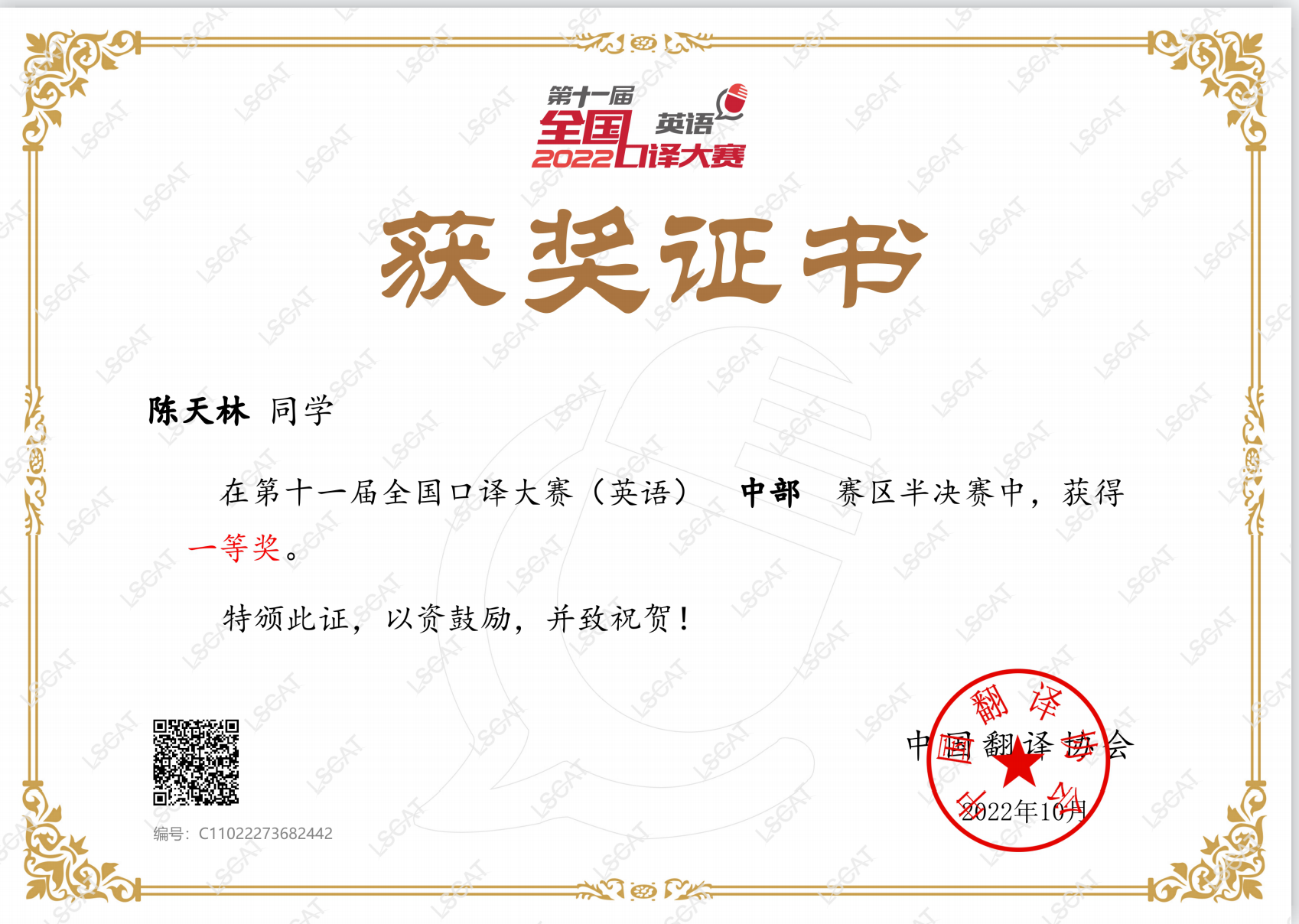 全国口译大赛是由中国外文局指导、中国翻译协会主办的全国性大型专业类口译比赛,已经连续举办十一届,是迄今为止参赛人数最多、影响力和含金量最大的口译类全国赛事。本次大赛从2022年4月开始启动,历时数月,包括初赛、复赛(省赛)、半决赛(大区赛)、全国总决赛(交传和同传)等数个环节。自赛事启动以来,外国语学院高度重视,由何晓莉、胡康娜和陈琼老师组成的口译竞赛团队悉心指导学生进行口译技能训练和实操。最终,陈天林和司元己两位同学在9月份举行的湖北赛区半决赛中凭借扎实的专业功底、流利的语言表达,一路过关斩将获得一等奖和二等奖。