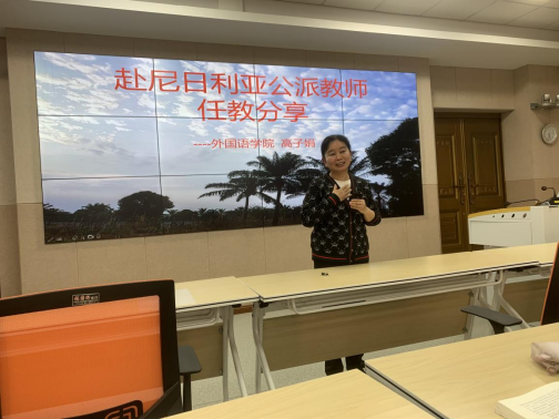 2022年3月28日外国语学院联合国际合作交流处在教师发展中心1305教室举办了赴非洲尼日利亚公派汉语教师任教分享微沙龙,全院教师和教学督导参加了该活动。