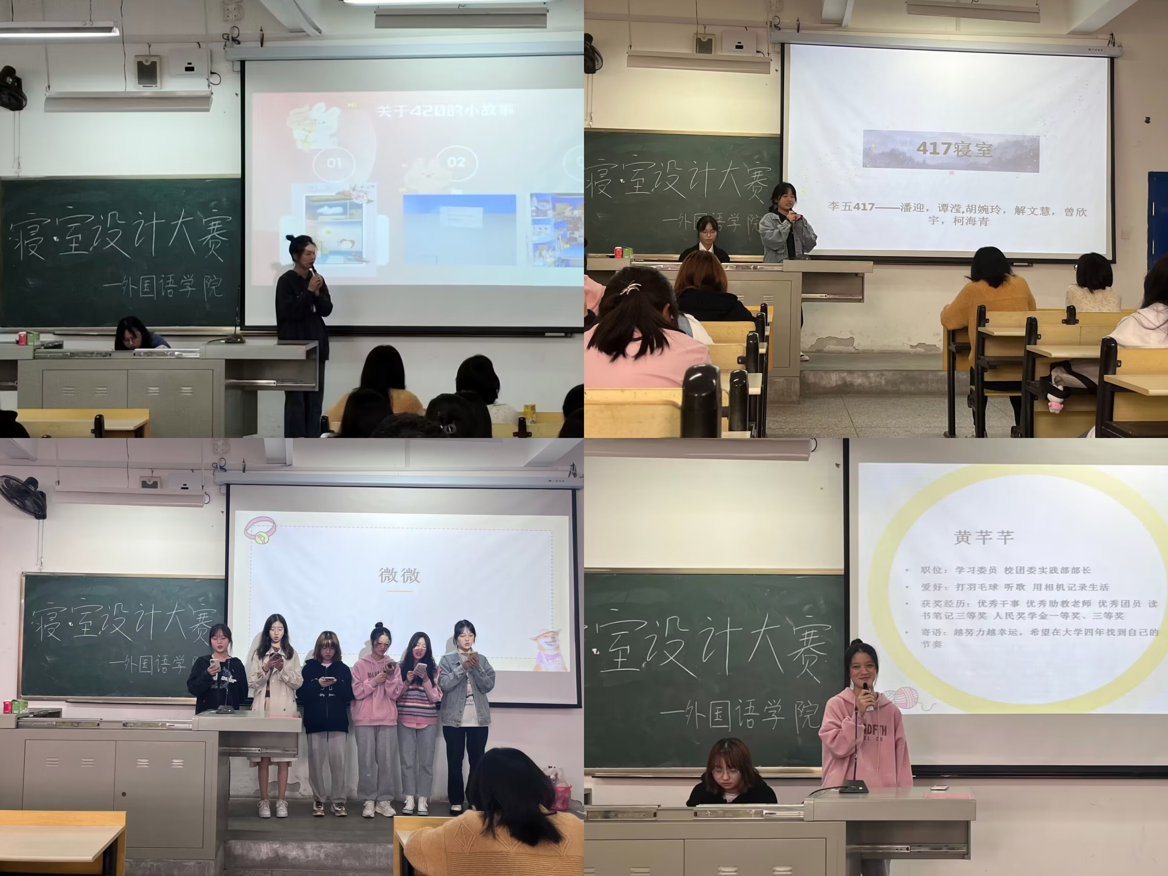 比赛分初赛、决赛两个阶段进行。初赛经过老师和学生评委现场参观评选,选出6个寝室进入现场展示决赛环节。决赛现场,入围寝室代表结合PPT依次上台进行展示,介绍各自寝室的设计理念、设计风格等。一个个温馨的小窝、一个个暖心的故事,一个个精彩的节目,见证了寝室成员间的友谊与梦想。