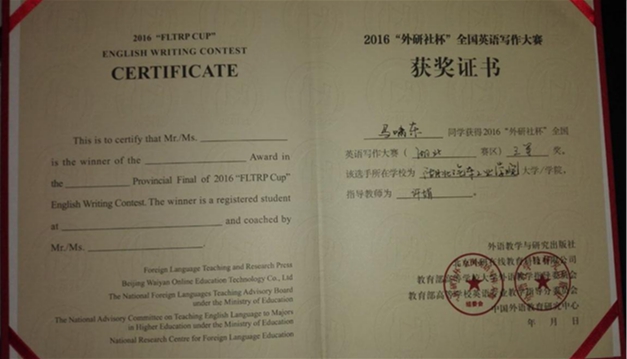 近日,从2016“外研社杯”全国英语阅读、写作比赛组委会传来喜讯,我校2名同学参赛,他们凭借扎实的基本功和较强的思辨能力在比赛中发挥出色、表现优秀,其中蒋理同学荣获“阅读大赛”湖北赛区二等奖;马啸东同学荣获“写作大赛”湖北赛区三等奖。