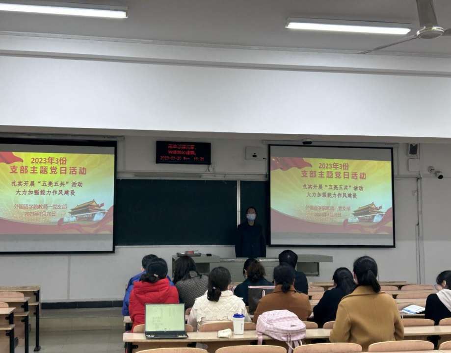 (本网讯)为落实学校“扎实开展‘五亮五共’活动,大力加强能力作风建设”要求,外国语学院教师一党支部于3月20日下午在5203教室召开3月份支部主题党日活动。活动由支部书记柯宁立同志主持,支部全体党员悉数参加。