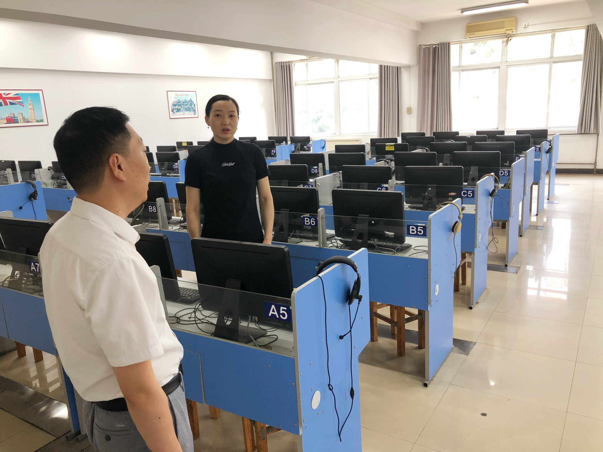 郭义坤书记带领学院领导班子逐个走访了各教研室、办公室,认真排查了可能存在的安全隐患,同时,重点巡查了位于第五教学楼和产教大楼的语言实训中心,了解了语音室安全状况以及存在的问题。