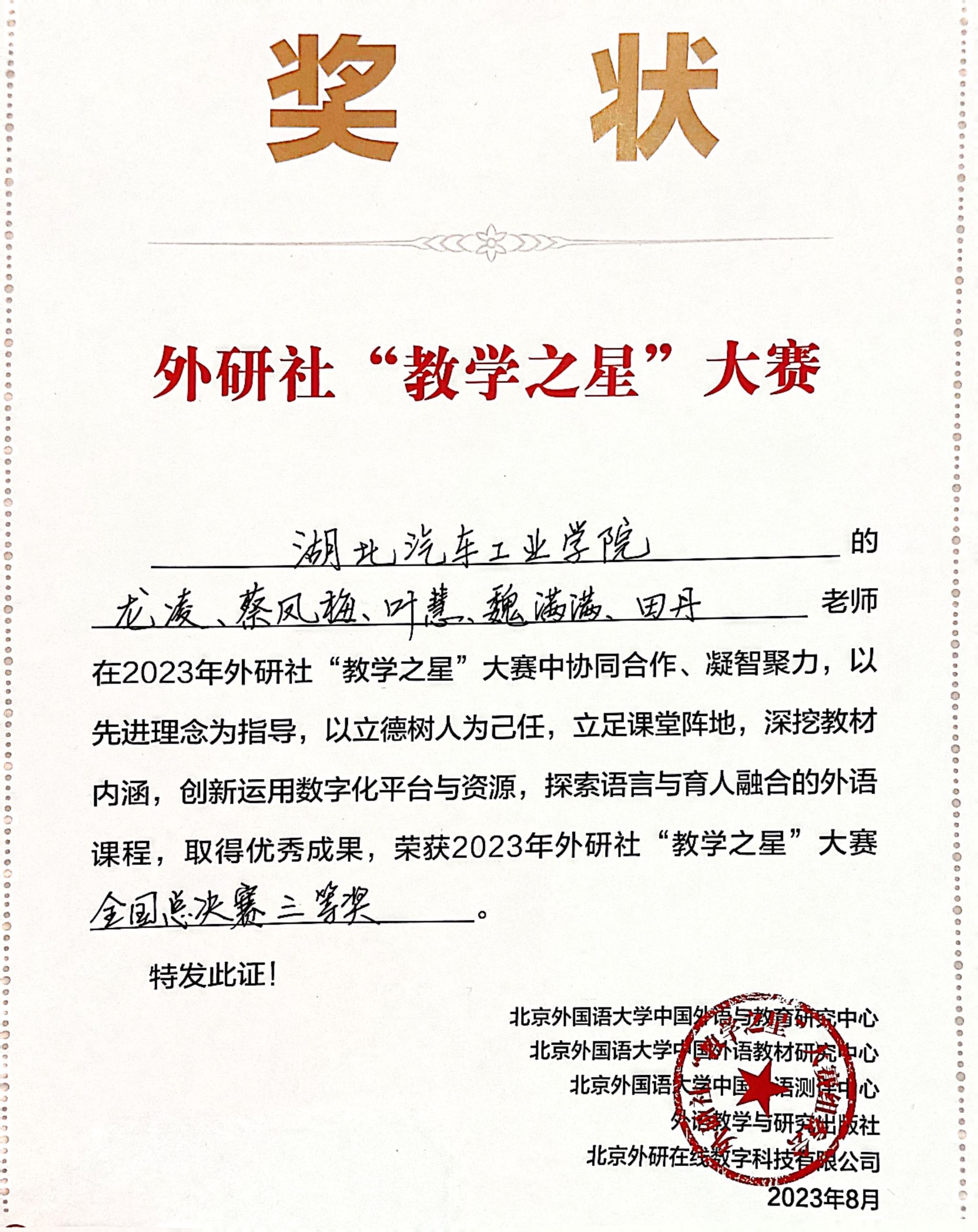 8月10日,2023年外研社“教学之星”大赛全国半决赛在西安落下帷幕,我校外国语学院龙凌、蔡凤梅、叶慧、魏满满、田丹老师组成的教师团队荣获二等奖(全国总决赛三等奖)。这是外国语学院参加该项赛事以来取得的历史最佳成绩。