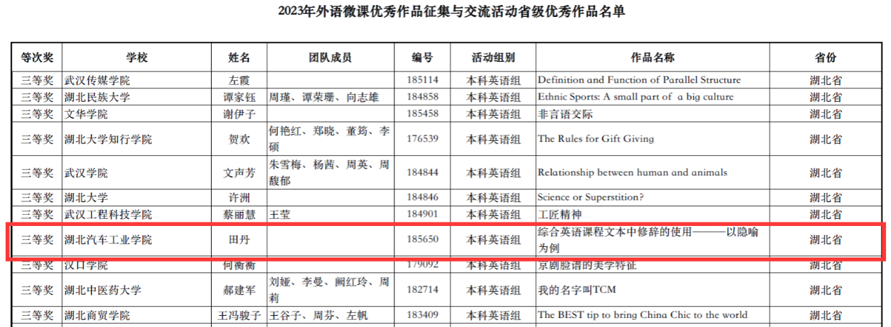 8月31日,由高等教育出版社主办的“2023年外语微课优秀作品征集与交流活动”省级优秀作品获奖名单公布,我院田丹老师的微课作品:综合英语课程文本中修辞的使用---以隐喻为例,在本科英语组评比中喜获湖北省微课三等奖。