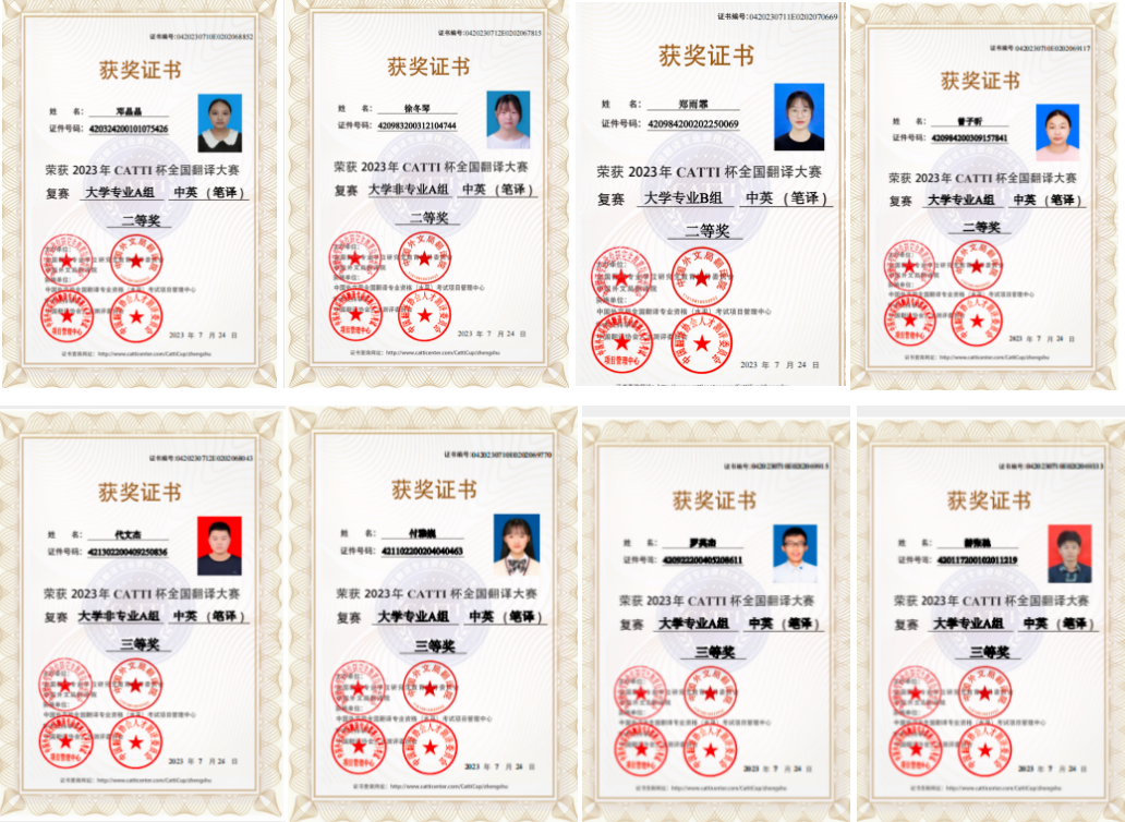2023年,我校本部与科院共149名同学报名参与赛事,经过组委会初赛选拔,我校3人获得二等奖,22人获得三等奖,10人获得优秀奖,25位同学进入复赛(省赛)。2023年7月24日,复赛成绩及晋级揭晓,经过外国语学院翻译系教师团队的精心培训与参赛选手的个人努力,我校8位同学脱颖而出。翻译201邓晶晶、英语214曾子昕、营销211徐冬琴、K英语201郑雨霏四位同学获得二等奖;电气211代文杰、翻译201付雅巍、英语215罗英杰、英语Z203游张驰四位同学获得三等奖,8位同学均进入全国决赛