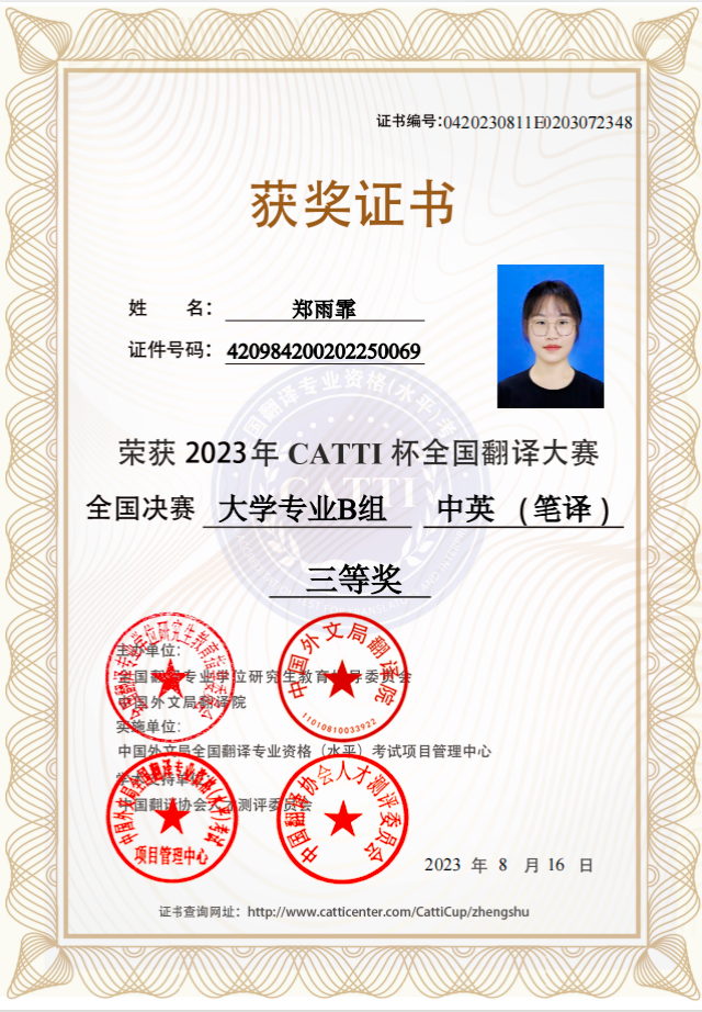 2023年8月16日,由全国翻译专业学位研究生教育指导委员会和中国外文局翻译院联合主办、中国外文局CATTI项目管理中心负责实施的2023年“CATTI杯”全国翻译大赛决赛成绩揭晓,我校科技学院K英语201郑雨霏同学获得全国决赛大学专业B组中英(笔译)三等奖,为我校参与此项赛事以来获得的最佳成绩。