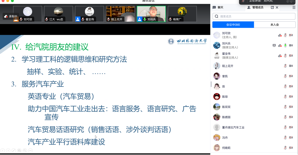 2023年11月14日晚7点,外国语学院邀请四川外国语大学刘兴兵教授做题为国家社科项目选题、申报技巧与经验的讲座。会议由科研副院长翟全伟主持,外院全体教师及部分校外教师参与会议。