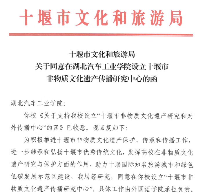 设立“十堰市非物质文化遗产传播研究中心”,具体工作由外国语学院承担负责。
