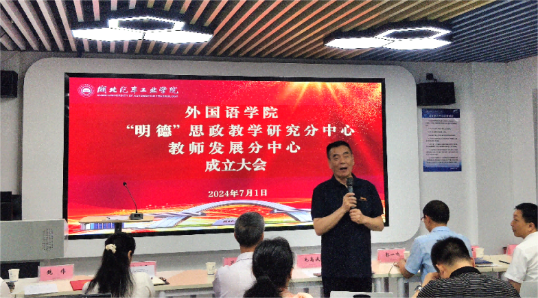 7月1日下午,外国语学院在产教大楼SX301多功能报告厅召开“明德”课程思政教学研究分中心、教师发展分中心成立大会。学校本科教学督导组组长毛高波教授、本科教学督导孔焱清研究员、马克思主义学院副院长成继平教授、教师发展中心郭一鸣教授、外国语学院党政领导班子和全体教职工出席大会,大会由副院长王辰晖教授主持。