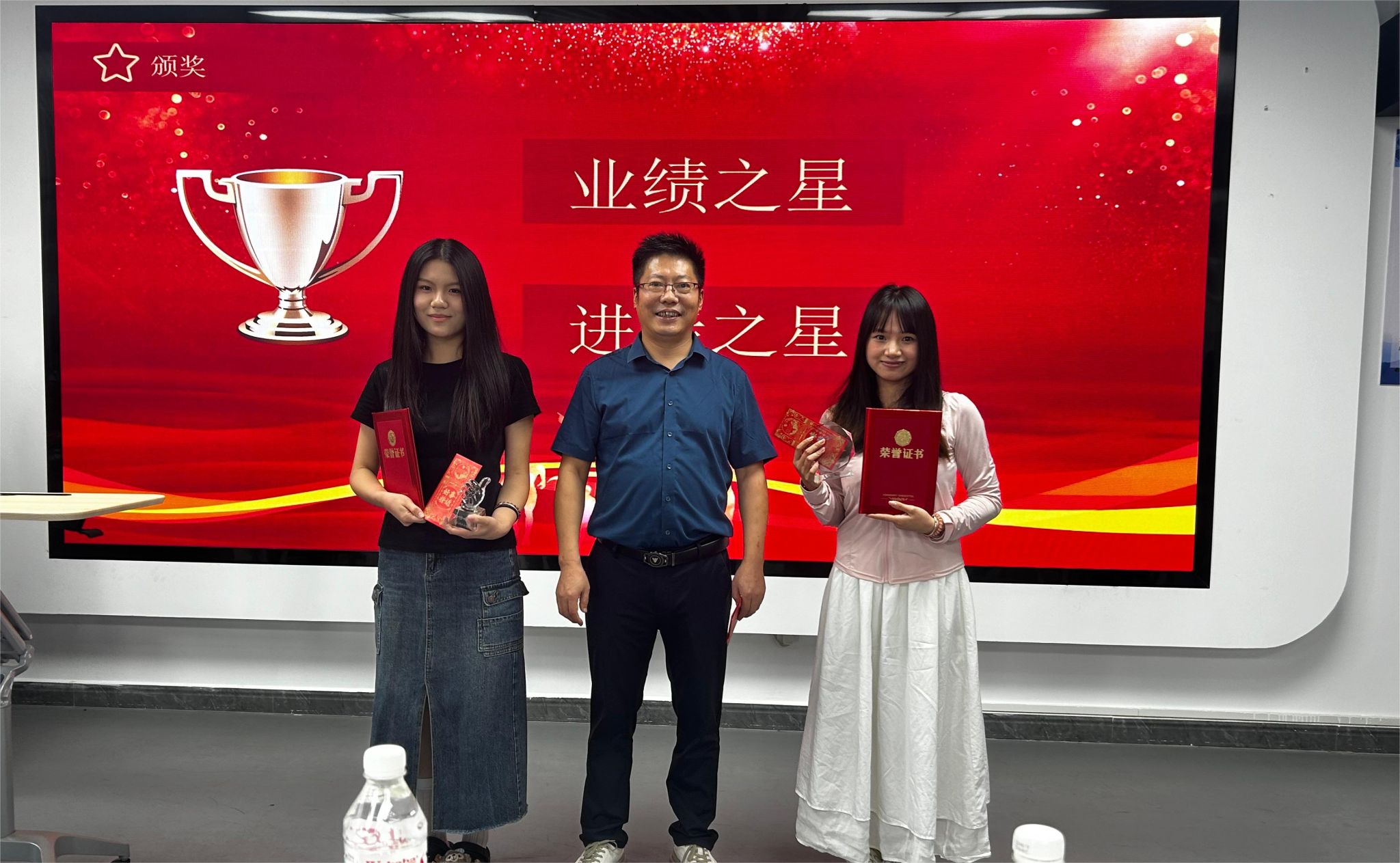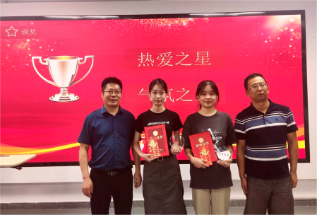 在表彰会上,东维科技有限公司和外国语学院共同向“业绩之星”、“进步之星”、“优秀班组长”、“热爱之星”和“气氛之星”颁发了获奖证书、奖牌和奖金。之后,3名优秀实习生代表分享了企业实习成长心得和收获。
