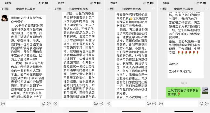 交流结束后,学生难掩心中的感激,立即通过信息向外语老师表达了自己的感激之情。学生表示,外语老师的专业水平和热情教学让他受益匪浅,不仅解答了他在英语学习上的困惑,还激发了他对英语学习的更大热情。