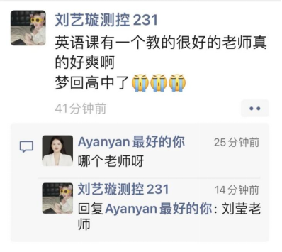 10月1日下午,一张来自机械学院辅导员陈君颜老师转发该学院一名学生朋友圈截图。该学生在朋友圈中高度赞扬了外语学院的英语教师刘莹,并配文称:“英语课有一个教的很好的老师,真的好爽啊,感觉梦回高中。”这一评价不仅体现了对外语学院英语教学质量的认可,也勾起了许多学生对高中英语学习时光的温馨回忆。
