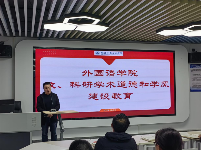 10月21日下午,外国语学院在产教大楼301展开了教、科研学术道德和学风建设教育。会议由副院长翟全伟主持,全体教职工参与了此次学习活动。