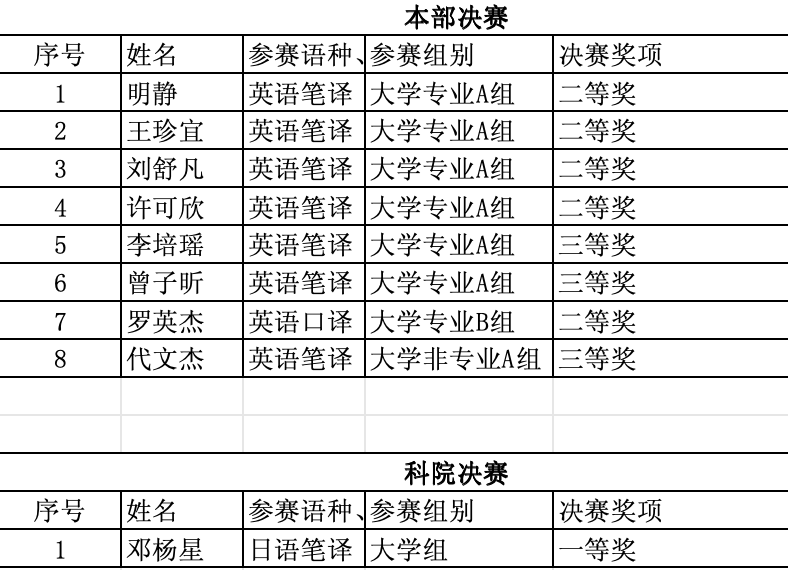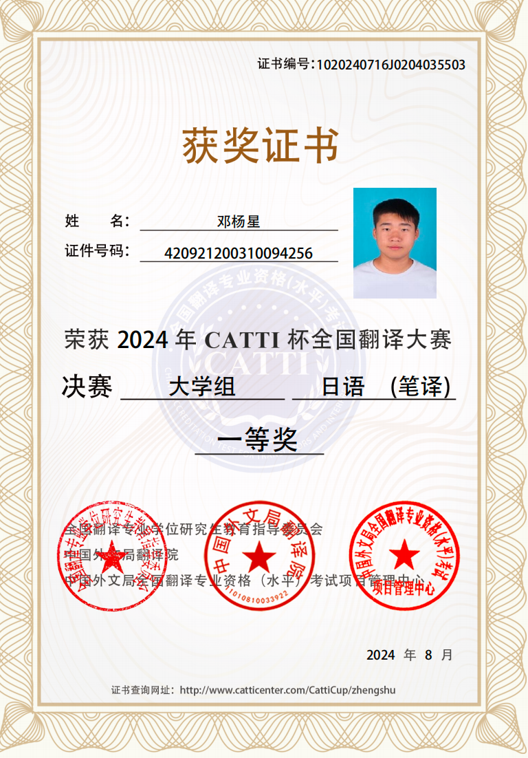 进入决赛阶段,我校选手更是展现出了非凡的翻译技巧和深厚的语言功底。他们凭借精准的理解、流畅的表达和出色的翻译质量,斩获了多个奖项,充分展示了我校学子在翻译领域的全面实力和卓越风采。其中,科院K电信221的邓杨星同学凭借出色的日语翻译能力,荣获日语组全国决赛一等奖,这是我校参与本赛事以来首次获得日语组比赛奖项,具有里程碑式的意义。
