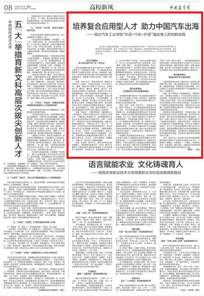 最近,《中国教育报》聚焦学院“外语+汽车+外贸”融合育人实践经验