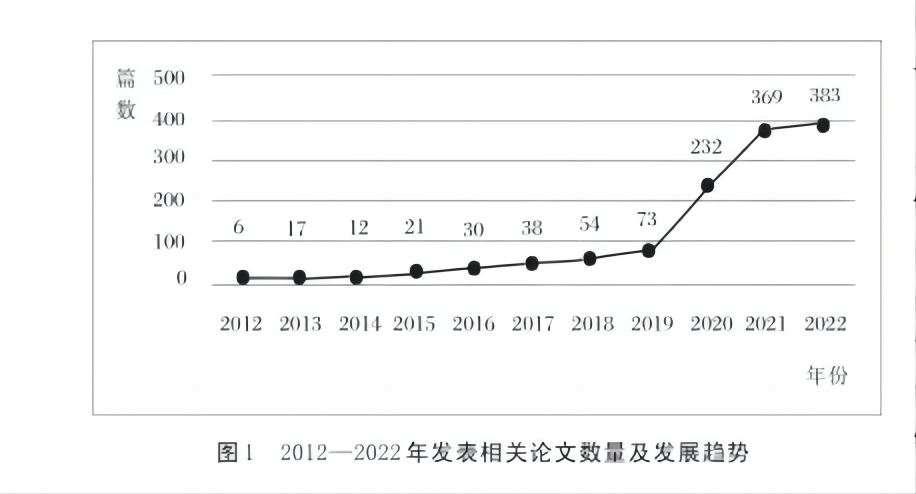 第一阶段,2012—2017年。该时期学者们对于产业学院建设具备了一定的理论基础和构想。党的十八大提出现代职业教育体系的改扩建是国家战略要点,有效推动了产业学院在理论研究与实践层面的建设及试点试行,由此政策推行带来研究文献数量日趋增长,但涨幅不大,发展较为平缓。