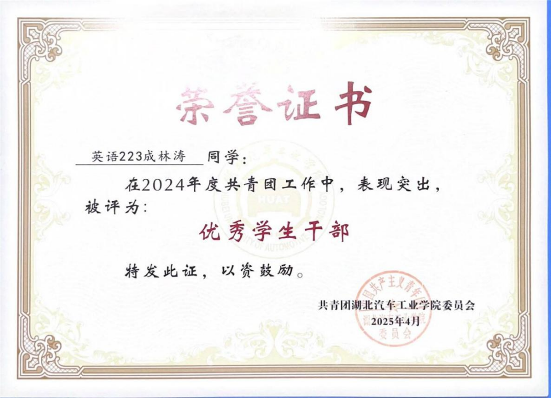 在学生工作与志愿服务的赛道上,成林涛始终以饱满的热情践行责任,用行动传递温暖力量。担任学生会主席期间,他以“服务同学、建设校园”为目标,统筹策划外语外贸文化节、英语四六级分享会等多项校园活动,始终把倾听同学需求、解决实际问题作为工作出发点。在志愿服务方面,他积极投身志愿服务,累计时长达到 428 小时,曾参与世界武当太极大会、中国低空经济发展大会等多项志愿服务活动。学生工作的统筹协调与志愿服务的无私奉献,不仅让他深刻理解了责任与奉献的内涵,更锤炼了他的沟通能力与社会责任感。
